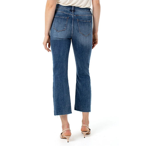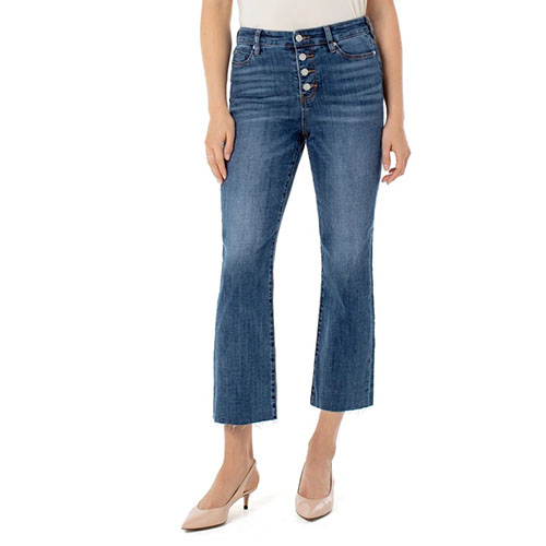 The stovepipe is a trend forward silhouette with seasonal versatility. The Stevie High Rise jean by Liverpool is cropped at the perfect length with a raw hem detail. Seen here with exposed buttons.